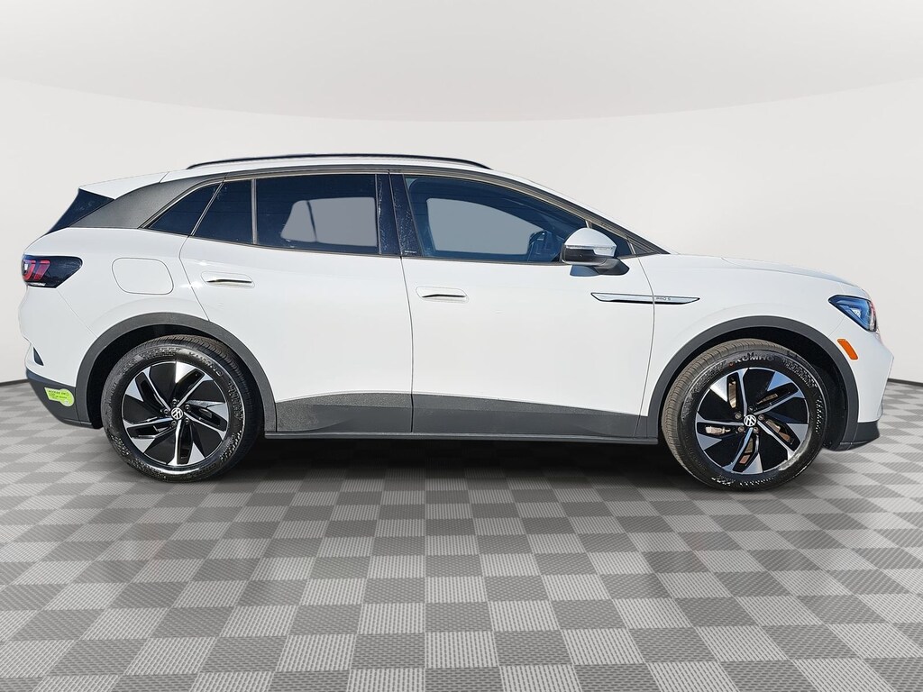 ID.4 Pro S, Electric Motor, RWD, Glacier White Metallic, Galaxy Black w/Perforated V-Tex Leatherette Seating Surfaces, 4 Wheel Independent Suspension, 4.39 Axle Ratio, 7 Speakers, ABS brakes, Air Conditioning, Alloy wheels, Auto High-beam Headlights, Auto-dimming Rear-View mirror, Automatic temperature control, Brake assist, Bumpers: body-color, Delay-off headlights, Driver door bin, Driver vanity mirror, Driver's Seat Mounted Armrest, Dual front impact airbags, Dual front side impact airbags, Electronic Stability Control, Emergency communication system: VW Car-Net services (capabilities require enrollment or subscription), Exterior Parking Camera Rear, Four wheel independent suspension, Front anti-roll bar, Front Bucket Seats, Front dual zone A/C, Front fog lights, Front reading lights, Fully automatic headlights, Heated door mirrors, Heated Front Seats, Heated front seats, Heated steering wheel, Illuminated entry, Low tire pressure warning, Memory seat, Navigation System, Occupant sensing airbag, Outside temperature display, Overhead airbag, Overhead console, Panic alarm, Passenger door bin, Passenger seat mounted armrest, Passenger vanity mirror, Perforated V-Tex Leatherette Seating Surfaces, Power door mirrors, Power driver seat, Power Liftgate, Power passenger seat, Power steering, Power windows, Radio data system, Radio: Discover Pro Max w/12" Touchscreen Nav, Rain sensing wipers, Rear anti-roll bar, Rear reading lights, Rear seat center armrest, Rear window defroster, Rear window wiper, Remote keyless entry, Roof rack: rails only, Speed control, Speed-sensing steering, Split folding rear seat, Spoiler, Steering wheel mounted audio controls, Telescoping steering wheel, Tilt steering wheel, Traction control, Trip computer, Turn signal indicator mirrors, Variably intermittent wipers, and Wheels: 19" 5-Spoke 2-Tone Machined Alloy.